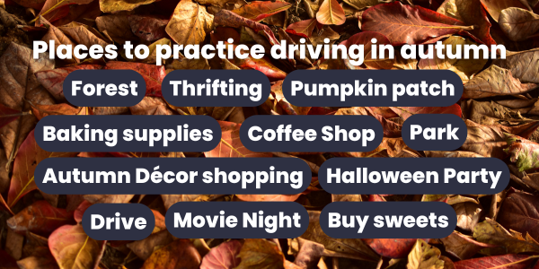 It doesn’t need to be complicated to get driving practice in autumn, you could simply go for a drive! Going around country roads to see sights and scenery. In suburban areas you can look for Halloween decorations, or in the city you can see what stores have in stock for the season.