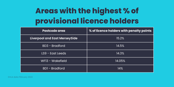 However, this doesn’t typically seem to be the case as just 0.6% of drivers in GU13 (the top place in the UK for provisional licence holders) have penalty points on their licence which is far below the national average of 5%.